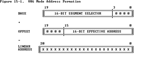 In V86 mode, the 80386 processor does not interpret 8086 selectors by referring to descriptors; instead, it forms linear addresses as an 8086 would. It shifts the selector left by four bits to form a 20-bit base address. The effective address is extended with four high-order zeros and added to the base address to create a linear address as Figure 15-1 illustrates.