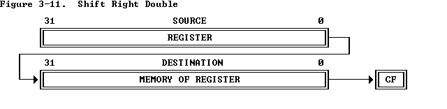 SHR (Shift Logical Right) shifts the destination byte, word, or doubleword operand right by one or by the number of bits specified in the count operand (an immediate value or the value contained in CL). The processor shifts zeros in from the left side of the operand as bits exit from the right side. See Figure 3-7.