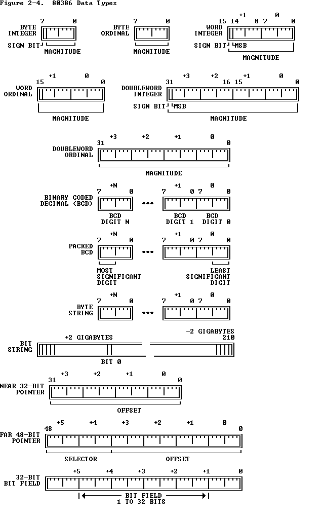 Although bytes, words, and doublewords are the fundamental types of operands, the processor also supports additional interpretations of these operands. Depending on the instruction referring to the operand, the following additional data types are recognized: